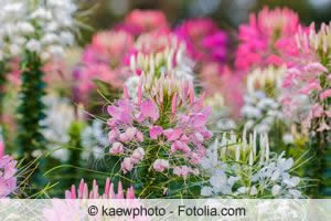 Die Spinnenblume zaubert filigrane Leichtigkeit in Staudenrabatte, Bauerngärten, Blumenbeete und große Kübel. Ihre Blütengala dauert zwar nur einen Sommer lang an; dafür gehen Pflege und Vermehrung einfach von der Hand. Ein sonniger Standort, nahrhaftes, durchlässiges Erdreich und eine Dosis Wasser zur rechten Zeit genügen vollauf, damit Cleome exotisch anmutende Blüten in Hülle und Fülle hervorbringt. Knipst der ambitionierte Verblühtes und Samenschoten regelmäßig aus, dankt das Kreuzblütengewächs die Mühe mit unaufhörlicher Vitalität bis weit in den Oktober hinein.